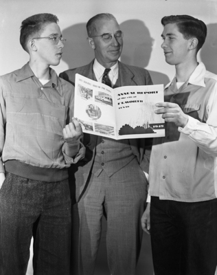 Guy A. Thelin, center, and sons, Robert, left, and Mark, right, look over a book telling of Fort Worth while here on visit from China and Sioux Falls, S. D. Thelin has been a high school teacher in China since 1924. Published in Fort Worth Star-Telegram, morning edition March 25, 1951.