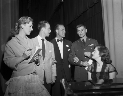 Fort Worth contestants gather around Horace Heidt backstage at Will Rogers Memorial Auditorium before competing in his Youth Opportunity Program. Left to right are Janan Hart, David Buster, Heidt, Sgt. Ralph E. Thompson, and Sara Rhodes. Published in Fort Worth Star-Telegram, morning edition March 26, 1951.