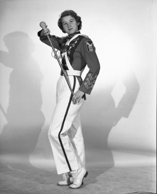 Majorette Peggy Coburn shown in uniform. Published in Fort Worth Star-Telegram, morning edition March 27, 1951.