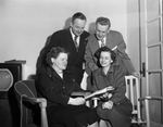 Miss Catherine Hammett, left, visiting leader of a two-day camping institute sponsored by the group work and recreation division of the Council of Social Agencies, discusses a new book on camping with council executives. Left to right are Sproesser Wynn, new division chairman; Herbert Tuchin, council president and Miss Marian Hardy, Institute chairman. Published in Fort Worth Star-Telegram, morning edition March 27, 1951.