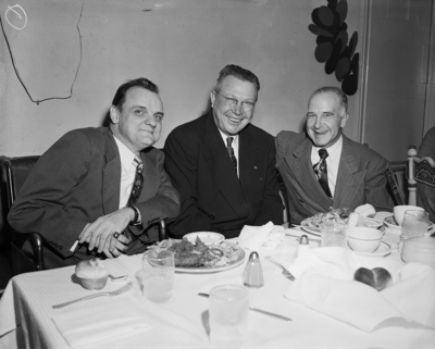 Coach H. N. (Rusty) Russell of SMU (center) relaxes at the Fort Worth SMU Alumni Club annual dinner night to enjoy a laugh with retiring president Forrest Clough and Ralph Beaver, who was elected new president. Published in Fort Worth Star-Telegram, evening edition March 27, 1951.