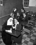 Sister Marie Therese of OLV Academy helps Sylvia Cowdin with the word "synthesis" which Sylvia missed only after spelling down 34 other candidates to win a spelling bee of seven Catholic schools at St. Alice's. Team winners behind them are, left to right, Margaret Quigley, Joann Rice, Lynn Ann Geary, Connie Jo Duncan and Connie Luby, all of St. James School in Dallas. Published in Fort Worth Star-Telegram, morning edition March 28, 1951.