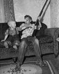 Jack Martin, 11, who lost an eye when hit by a BB gun pellet, advises his baby brother, Dannie, 2 and half, of the danger of the gun as he puts the rifle out of Dannie's reach. Published in Fort Worth Star-Telegram, evening edition March 28, 1951.