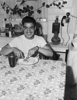Corp. Francisco Ramero Lopez relaxes at the kitchen of his home, 1305 North Calhoun, on leave from Korean front. He plants to catch up on his steak-eating. Published in Fort Worth Star-Telegram, morning edition March 29, 1951.
