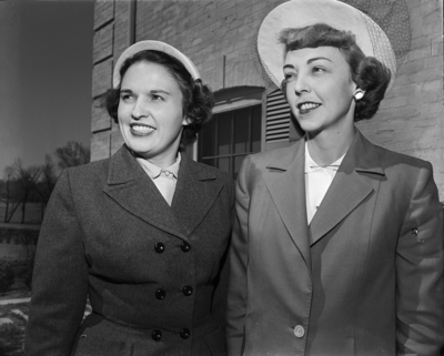 Mrs. Jack Henckels, right, was elected president and Mrs. Harry Womack, vice president of Pi Beta Phi Alumnae who met in the home of Mrs. Seth Barwise, 914 Alta. Published in Fort Worth Star-Telegram, evening edition March 29, 1951.