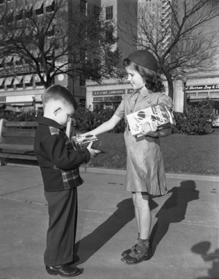 Cookies are right up a 4-year-old's alley, so John Baker, son of Mr. and Mrs. John Earl Baker of 2016 Binkley, finds Brownie Scout Joy Kite just the girl he has been looking for. Joy, who is the daughter of Mr. and Mrs. Haun Kite of 4924 Hovenkamp, will join other Scouts in the scale of Girl Scout cookies. Published in Fort Worth Star-Telegram, evening edition March 29, 1951.