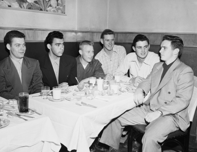 Signed to Brooklyn contracts after tryout camp at La Grave field were, left to right, Larry Nault of Detroit; George David, Detroit; Morris Mack, Aberdeen, South Dakota; Tommy Buchanan, Ballinger; Clifford Ohr, Truscott, Texas, and Jimmy Fox, Hastings, Nebraska. They'll join Dodger farm clubs. Published in Fort Worth Star-Telegram evening edition March 31, 1951.