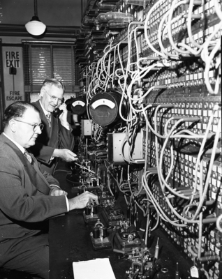 G. N. Westerfeld (with phone), Western Union superintendent here, and Sales Manager H. A. Metcalf check master switchboard in photo at left. Published in Fort Worth Star-Telegram morning edition, April 1, 1951.