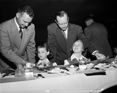 Camp Fire Girls in the Texas Christian University (TCU) area had no servant problem at their annual Dad and Daughter Banquet their dads did it all. Left to right are F. Howard Walsh and his daughter, D. Ann Walsh, 8, of 2425 Stadium Drive, and William S. Potts and daughter, Carol Anne, 10, of 3837 Westcliff Road South. Published in Fort Worth Star-Telegram morning edition, April 3, 1951.