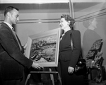 Wichita Falls artists were well-represented at the show, and two are shown here discussing the event. Left, Lloyd Collins, whose work is on the easel, and right, Mrs. Meak Turner. Collins is employed in the display department of a Wichita Falls store and Mrs. Turner is a member of Wichita Falls Art Association. Published in Fort Worth Star-Telegram morning edition, April 3, 1951.