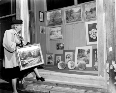 Mrs. Dollie Callaway, Bowie resident for 50 years, prepares to hang one of her paintings in a glassless hardware show window, one of the best display booths at Bowie's Sidewalk Art Show. Published in Fort Worth Star-Telegram evening edition, April 3, 1951.