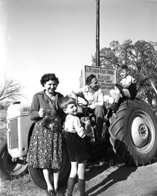 Laszlo Dahany, on tractor, ends his day's work with a refreshing visit from his wife and two of his four sons. Mrs. Dahany pours cold water for her husband into a glass held by 9-year-old Laszlo Jr. Up beside Pop on the tractor is Zsolt, 8. Published in Fort Worth Star-Telegram morning edition, April 4, 1951.