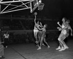 Image shows a basketball game between Texas Christian University (TCU) and Texas. George Cobb (16) and Frank Womack (12) tries to prevent TCU from getting off a shot, Tommy Taylor gets a layup shot from under the basket. TCU won 51-38.