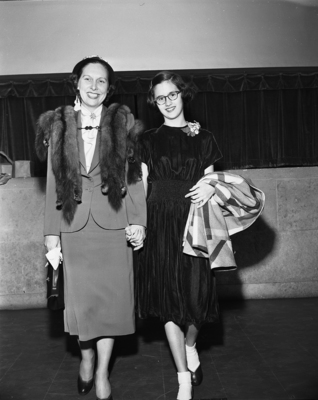 Mrs. Walter Strong, left, and Miss Ann Southard smile in anticipation of a pleasant evening as they start down the aisle to their seats for the "first night" of the opera "Girl of the Golden West". A woman wearing a fur scarf and suit, she has on gloves. A teenage girl with glasses wearing a dress. They are locking hands walking side by side. Published in Fort Worth Star-Telegram evening edition, March 5, 1951.