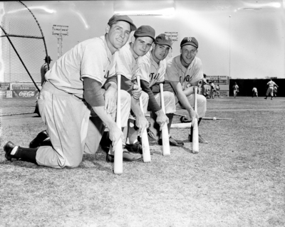 Starting outfielders for Fort Worth in its opener at Oklahoma City are left to right. Center Fielder Bill Sharman, Left Fielder R. A. Smith and Right Fielder Norman Postolese. Published in Fort Worth Star-Telegram evening edition, April 10, 1951. Four male baseball players in uniform, kneeling down on one knee with baseball bats in their hands on the ground.