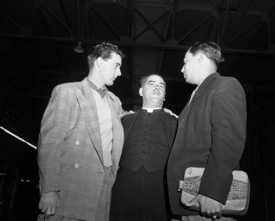 Father A. Banderes, Saint Mary's Mexican Mission rector, greets Pitchers Vincente Lopez, left, and Rene Solis. Published in Fort Worth Star-Telegram evening edition, March 4, 1951.
