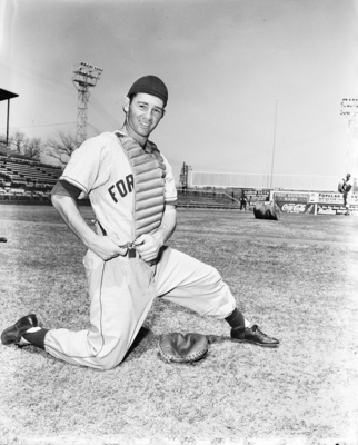 Norman Sherry is Manager Bobby Bragen's catching relief. A man on his knee smiling forward, wearing a baseball uniform and body pad. Published in Fort Worth Star-Telegram evening edition, April 7, 1951.