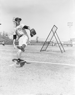Cats' Vicente Lopez seeks third victory. A man in position, foot kicked partially up and hands faced down with a baseball mitt on his hand. Baseball uniform and cap. Published in Fort Worth Star-Telegram evening edition, May 8, 1951.