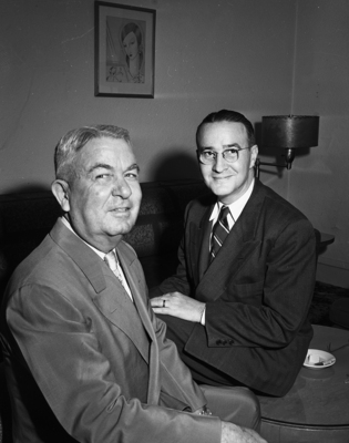 Fred L. Flynn, left, president of the Texas Mortgage Bankers Association, discusses program highlights of the association's annual convention, which opened at Hotel Texas, with Thomas E. Lovejoy Jr. of New York, president of the Manhattan Life Insurance Company. Published in Fort Worth Star-Telegram evening edition April 12, 1951.