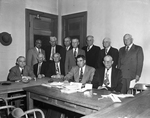 Photographed in their chamber at the County Courthouse, these men are the members of Tarrant county's Special grand jury. Seated, left to right, are H. W. Ladd, D. L. Brown, Q. K. Wheeler, Special Prosecutor John Honts and Jury Foreman Ray Finney. Standing, left to right, are H. H. Monroe, E. I. Green, J. E. Harper, R. T. Gillentine, Fred B. Porter, S. M. Graves, jury secretary, and Assistant Foreman H. C. Vandervoort. One juror, P. W. Riggins, was out of town when the photograph was made. Published in Fort Worth Star-Telegram morning edition April 8, 1951.