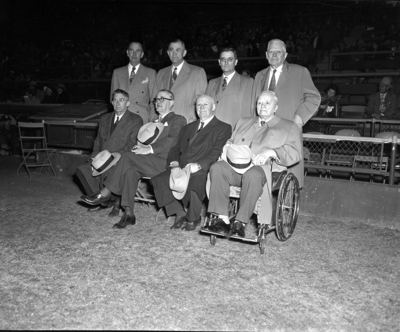 Presidents, past and present, shared honors with Cat rookies in first 1951 Texas League game at La Grave Field. Left to right, presidents taking part in pre-game ceremonies were, top row: Roy Westbrook, Clarence Kraft, John Reeves and Dr. Webb Walker; bottom row, Ted Robinson, J. Walter Morris, Stanley Thompson and Newton H. Lassiter. Lyle Olsen, bottom right, was one of young players shining in 6-3 victory over Tulsa. Eight men wearing a suit, four men standing up behind four men sitting down. Four men sitting down holding hats. Published in Fort Worth Star-Telegram evening edition, April 13, 1951.