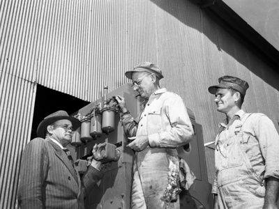 Business men report 100 per cent employment among Manfield citizens as the southern Tarrant County town make a bid for new residents working in the Fort-Worth-Dallas area. In photograph, Mayor C. H. Harrison, left; G. A. Craven, center, of Dallas, and Bill Gorman, day engineer of the Mansfield municipal power plant, look at $32,000 generator being installed. Published in Fort Worth Star-Telegram evening edition April 7, 1951.