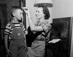 Mrs. Denver Hanson of 8309 Hanon Drive, White Settlement, is shown with her son Hollie, 6, after her return from the hospital and a heart valve operation. Mrs. Hanson's reaction to the operation: "It's wonderful." Published in Fort Worth Star-Telegram evening edition April 7, 1951.