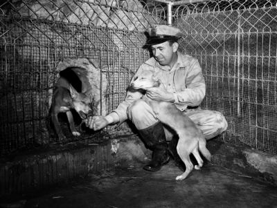 Attendant J. C. Smith is shown with two new residents, a couple of dingoes, Australian wild dogs. The zoo has several other new specimens ready for visitors. Published in Fort Worth Star-Telegram morning edition April 8, 1951.