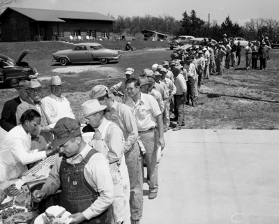 The picture reveals progressive stages in erecting a building, 63 by 21 feet, in a day at Camp Sweeney near Gainesville. Photograph shows the "chow" line formed by crafts men who tasted barbecue served by Mr. and Mrs. William T. Bonner of Gainesville. Behind Brown and Bryne are H. H. Franks, left, and E. R. Brown, Fort Worth. Published in Fort Worth Star-Telegram morning edition April 8, 1951.