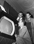 Harris P. Hoover, left, and C. M. Harris Jr., General Electric television dealers here, get their first glimpse of the new model with a 24-inch screen. Demonstrating the set is E. V. McNeese, appliance sales division manager of the firm's Dallas district. Published in Fort Worth Star-Telegram morning edition April 11, 1951.