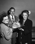 Miss Charlotte Grove, principal of Tandy School, right, was presented with a silver tray on her 25th anniversary at the school. Presenting the tray are Mrs. Morris Walker, president of the School's Parent-Teacher Association, and Cecil Black, president of the Dad's Club. Published in Fort Worth Star-Telegram morning edition April 12, 1951.