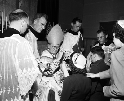 Among the 41 airmen and civilians confirmed at Carswell Air Base by Bishop William R. Arnold, left, were Mrs. John Ringlihan, wife of a staff sergeant, and Sargeant Orlando Parsiros. Published in Fort Worth Star-Telegram morning edition April 12, 1951.
