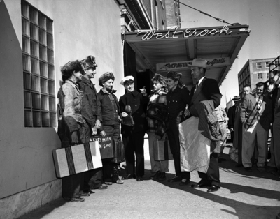 Traffic officer J. B. Hall gives directions to the Harrises of Cut and Shoot upon their arrival here for the state Golden Gloves tournament. Left to right are Cousin Armadillo Moorehead, Henry Harris, Uncle Bob Harris, Hall, Tobe Harris, Roy Harris and Principal J. T. Montgomery of William B. Travis Junior High School in Conroe. Henry Harris is the father of the fighters, Tobe and Roy. Published in the Fort Worth Star-Telegram morning edition, February 15, 1950.