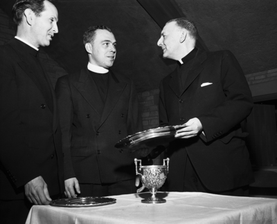Very Reverend Dom Gregory Dix, right, illustrates the simplicity of early-day Christian liturgy to Rev. Henry P. Roberts, left, rector of St. Luke's- in-the-Meadow, and Rev. W. J. Heilman, rector of Trinity Episcopal Church. Published in Fort Worth Star-Telegram morning edition April 13, 1951.