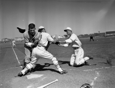 TCU's Bill Elliott collides with Texas catcher Randy Biesenbach while scoring in fifth inning on Wade Stepp's high bounder to Pitcher Jim Ehrler, right, with ball, who lunges too late for tag. Texas won, 12-4. Published in Fort Worth Star-Telegram morning edition April 14, 1951.
