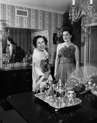 Mrs. Joe N. Petta, left, new president of the Woman's Auxiliary to the Fort Worth District Dental Society, is shown with Mrs. L. E. Taylor at the auxiliary tea and style show held recently in the home of Mrs. B. W. Spencer, 3105 Fairfield. Published in Fort Worth Star-Telegram evening edition April 17, 1951.
