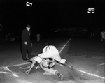 Billy Costa, Houston shortstop, is tagged at the plate by the Cats' Norm Sherry as he tries to score from second on a single in the first inning of the game at La Grave Field. Umpire Dick Nash called him out, and this started argument that resulted in Buff bench being cleared by umpire.