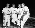 Latest to suit out with the Cats are left to right, Pitcher Arturo Seijas, Pitcher Pete Mondorff, Infielder Ashton Heckel, Pitcher Jack Banta. Four men wearing white baseball uniforms with a logo on the side of the front. They have caps on their heads huddle together. Published in Fort Worth Star-Telegram morning edition, April 18, 1951.