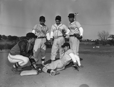 Tech Coach Harry Mullins, left, with First Baseman Horace Barbola as victim, shows Third Baseman Amos Urquidi, Shortstop Alfred Ochoa and Second Baseman Tico Gonzales, left to right, proper method of tagging sliding base runner. Tech shares third in District 5-AA baseball race. Published in Fort Worth Star-Telegram evening edition April 17, 1951.