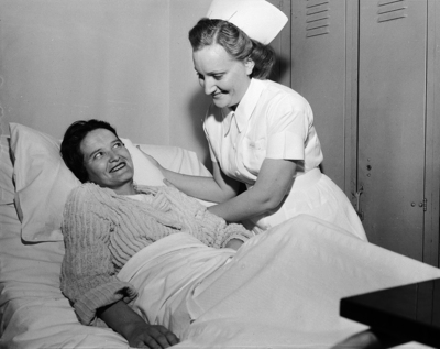 Mrs. Mildred Chapman, left, smiles as she listens to the voice of her nurse, Gertrude Gentry. Mrs. Chapman recently underwent an operation that restored her hearing.