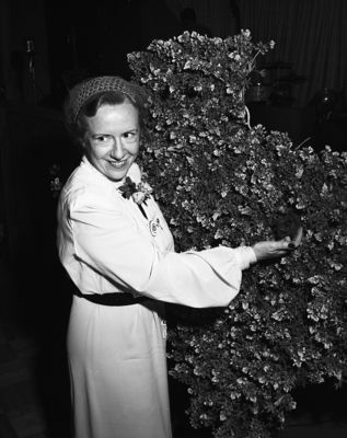 Mrs. Minnie P. Cooper of Corsicana, president-elect of the Texas Federation of Business and Professional Women's Clubs, admires the rose used to symbolize Fort Worth in a map of Texas made of bluebonnets. The flower arrangement, made by Mrs. Josephine Prichard, was the decorative centerpiece of the stage at the B&PW's Bluebonnet Festival dinner at the Keystone Room. Published in Fort Worth Star-Telegram morning edition April 17, 1951.