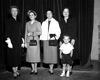 Four of the eight winners of first prizes in the Star-Telegram's Home Sewing Contest are shown here. Left to right, Mrs. H. H. Cole, Arlington, senior tailored dress; Mrs. Jimmie Allen, Plainview, senior suit; Miss Carlene Burton, North Side High student, high school coat; and Mrs. Virginia Wilton, 662 Sandell Dr., children's division, modeled by her son, John. Published in Fort Worth Star-Telegram evening edition April 19, 1951.