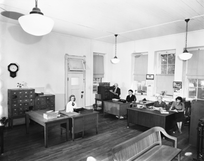 Miss Kathleen Miller, Miss Susie McCoy, Mrs. Elizabeth Doyle, Miss Willie Mae Thompson and Miss Jean Rembold, left to right, in the room which houses fantastically complete files on athletes.