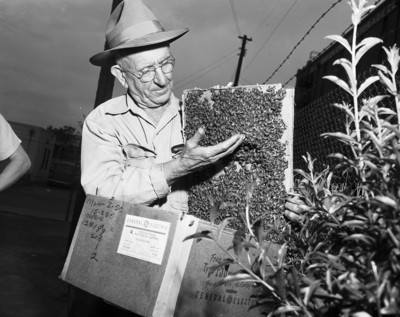 Image shows Paul Carpenter, 4106 Ave. G, holding a wood board, with a swarm of bees on it. He caught the bees in a meter box after finding them in a bust at 6th and Jones. Published in the Fort Worth Star-Telegram morning edition, April 24, 1951.