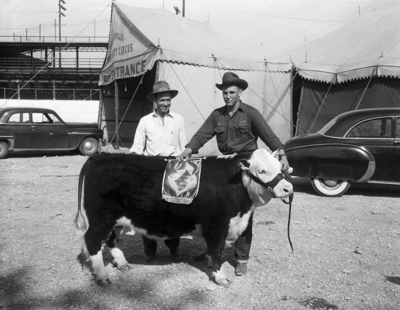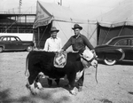 Image shows Ralph McLaughlin, left, Muenster, and Glen Helman, with 865 lb. Hereford steer . The steer was judged grand champion of the annual Gainesville Spring Club show. Ralph McLaughlin is a Muenster vocational agriculture teacher and Glen Helman, Muenster Future Farmers of America (FFA) member. The steer was a Future Farmers project and was exhibited along with 31 other calves. Published in the Fort Worth Star-Telegram morning edition, April 20, 1951.