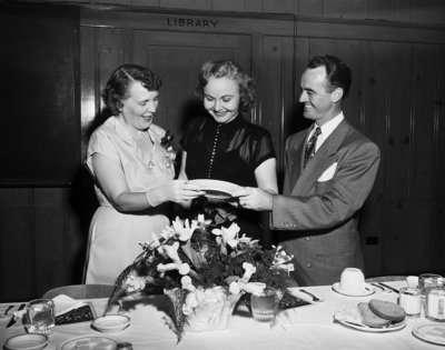 Mrs. Emma-dean Berry, center, receives a hand-painted plate naming her Grand Prairies most distinguished woman of 1950. from Mrs. Kay Spradling, left, at the Business and Professional Women's Club banquet in Grand Prairie. Judge Robert A. Hall of Dallas looks on. Published in Fort Worth Star-Telegram morning edition April 20, 1951.