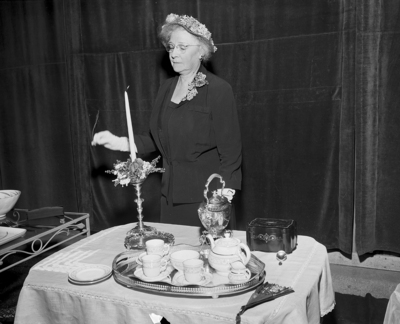 Image shows Mrs. W. P. Delafield, Dallas, with tea table. She is lighting the candle of "Grandmother's afternoon at Home" tea table for the Fort Worth Garden Club at Southwestern Exposition and Fat Stock Show. Published in the Fort Worth Star-Telegram morning edition, April 21, 1951.