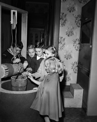 West Van Zandt Elementary School Children, regular visitors to the Fort Worth Children's Museum, are first among the contributors to the Museum's finance campaign. Dropping coins in the wishing well, at the museum, are, left to right, Mike Muncy, Caroline Chandler, Dick Cosgrove, Gwendolyn Lamb, and Linda Burnham.