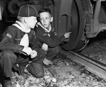 Object of fascination for two Cub Scouts Saturday was the giant wheel of a train coach. Inspecting it are Pat Blanscet, 9, of 3312 West 4th, left, and Jeri Harper, 9, of 1326 Pennsylvania. Neither had ever ridden a train before their trip Saturday.