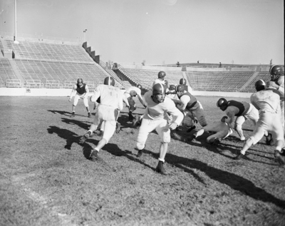 The "T" formation has come to Texas Christian University and here's Dan Wilde (right) handing off to Jimmy Hickey (11) in the scrimmage.